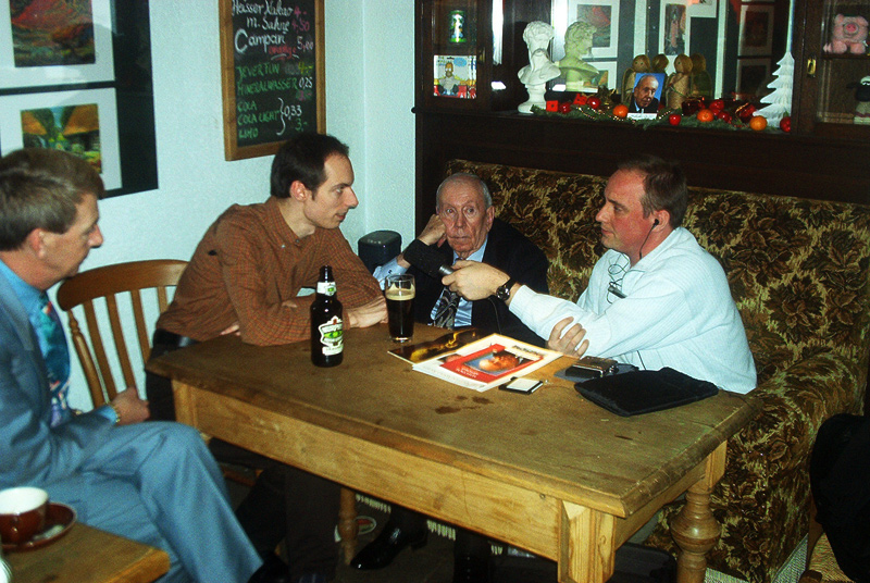 Markus Bruderreck vom Westdeutschen Rundfunk interviewt Tobias van de Locht und Sir Malcolm Arnold. Links: Sir Malcolms Pfleger Anthony Day. Düsseldorf im November 2002